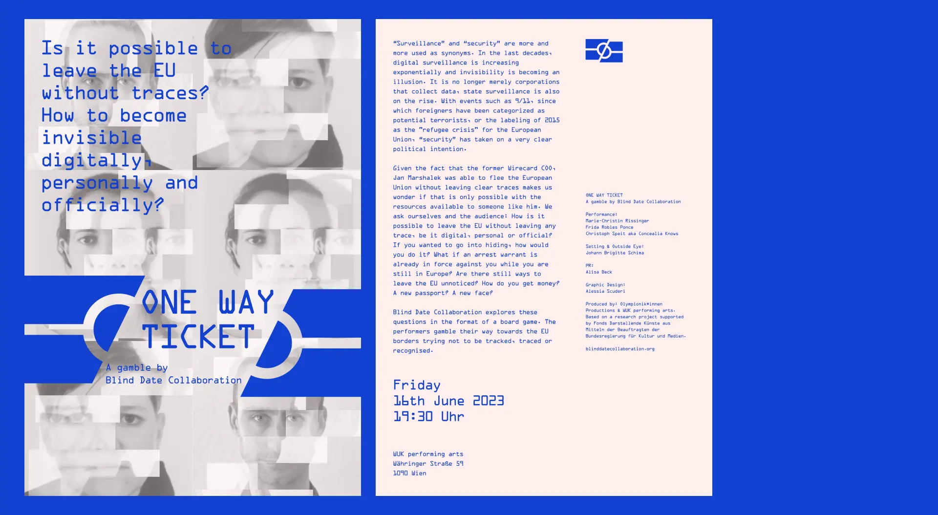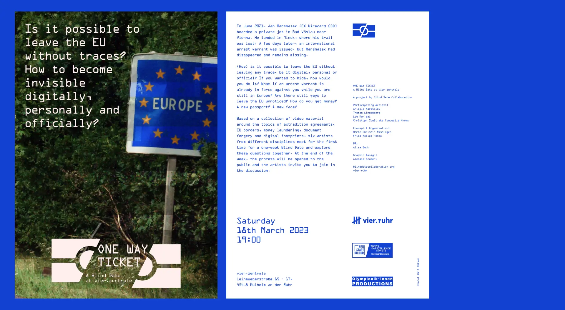 "Jan Marshalek (EX Wirecard COO) boarded a private jet in Bad Vöslau near Vienna in June 2021. He landed in Minsk, where his trail was lost. A few days later, an international arrest warrant was issued, but Marshalek had disappeared and remains missing. (How) is it possible to leave the EU without leaving any trace, be it digital, personal or official? If you wanted to hide, how would you do it? What if an arrest warrant is already in force against you while you are still in Europe? Are there still ways to leave the EU unnoticed? How do you get money? A new passport? A new face? Based on a collection of video material around the topics of extradition agreements, EU borders, money laundering, document forgery and digital footprints, six artists from different disciplines meet for the first time for a one-week Blind Date and explore these questions together. At the end of the week, the process will be opened to the public and the artists invite you to join in the discussion." – Blind Date Collaboration